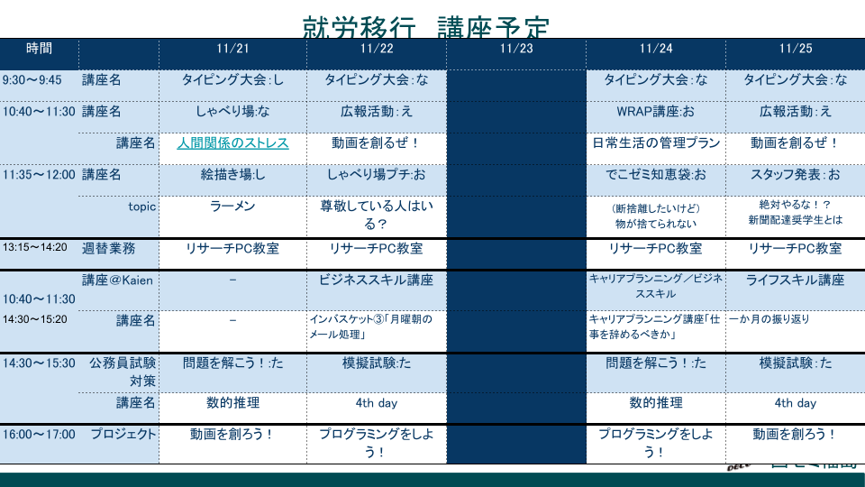 22/11/21週 講座予定表遠藤 一歩2022年11月20日読了時間: 1分5つ星のうちNaNと評価されています。凸ゼミ福島の今週の講座予定表です。~11月の新しい試み~①動画プロジェクト :みんなで動画作成を楽しむ時間②プログラミング大会:みんなでプログラミングを楽しむ時間③ものづくり実習 :裁縫を通じてものづくりを学ぶ時間①~③全て、途中参加OKな仕組みにしております!①は月・木の放課後②は火・金の放課後③は第2・第4火曜日午後保護猫施設での実習生も募集中です!#凸ゼミ #発達障害 #福島市 #就労支援 #就労移行 #自立訓練 #生活訓練 #ひだまりねこ #ネコ #ねこ #猫 #保護猫