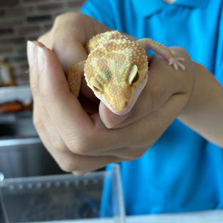▼レオパードゲッコー(通称レオパ)と触れ合うS。蛇も触れます。